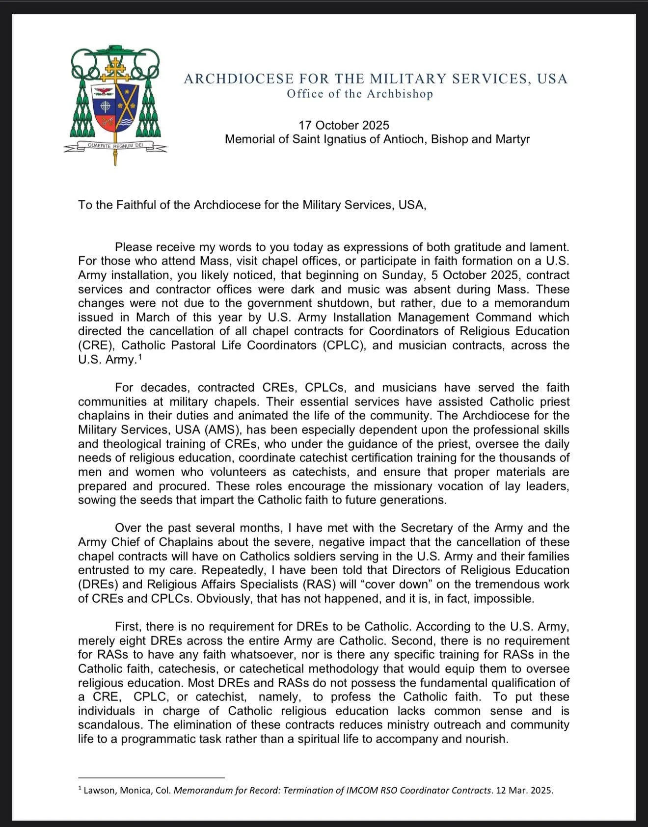 For the entire letter from Archbishop Broglio, it can be accessed here: https://www.milarch.org/archbishop-broglio-issues-statement-on-u-s-army-cancellation-of-all-religious-support-contracts-for-army-chapels/
